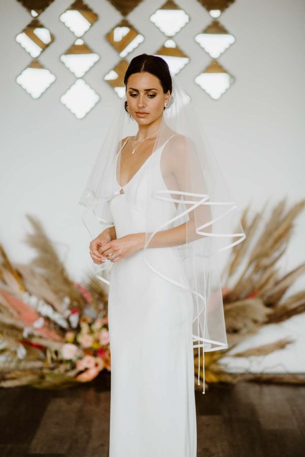 The Brittany veil is a classic and traditional style veil with a satin bias binding edge finish that flows so beautifully. The satin binding is a thicker, more sumptuous satin edge than our lighter-weight ribbon options.