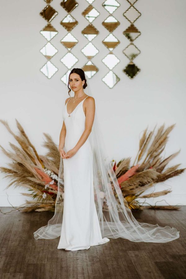 - Veil dimensions: 114”x108″ aka Cathedral length – full width. (See our length guide and our width guide)