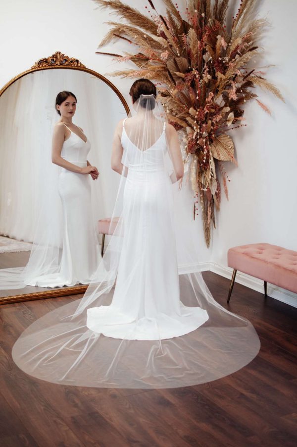 Maya is the perfect choice for brides who want a veil that enhances their look without taking centre stage. With no decorative elements and a simple hand-cut edge, this chapel length “barely there” veil is as sheer and delicate as it gets.