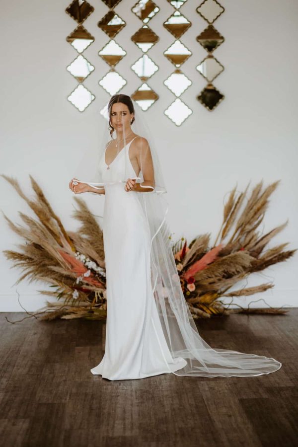 Our Riannah veil – a chapel length wedding veil with a satin edge – is a very popular option for brides. With the resurgence of silk and satin dresses, the Riannah veil has been extremely popular of late. It looks amazing next to either style, and really ties everything together. We love it!